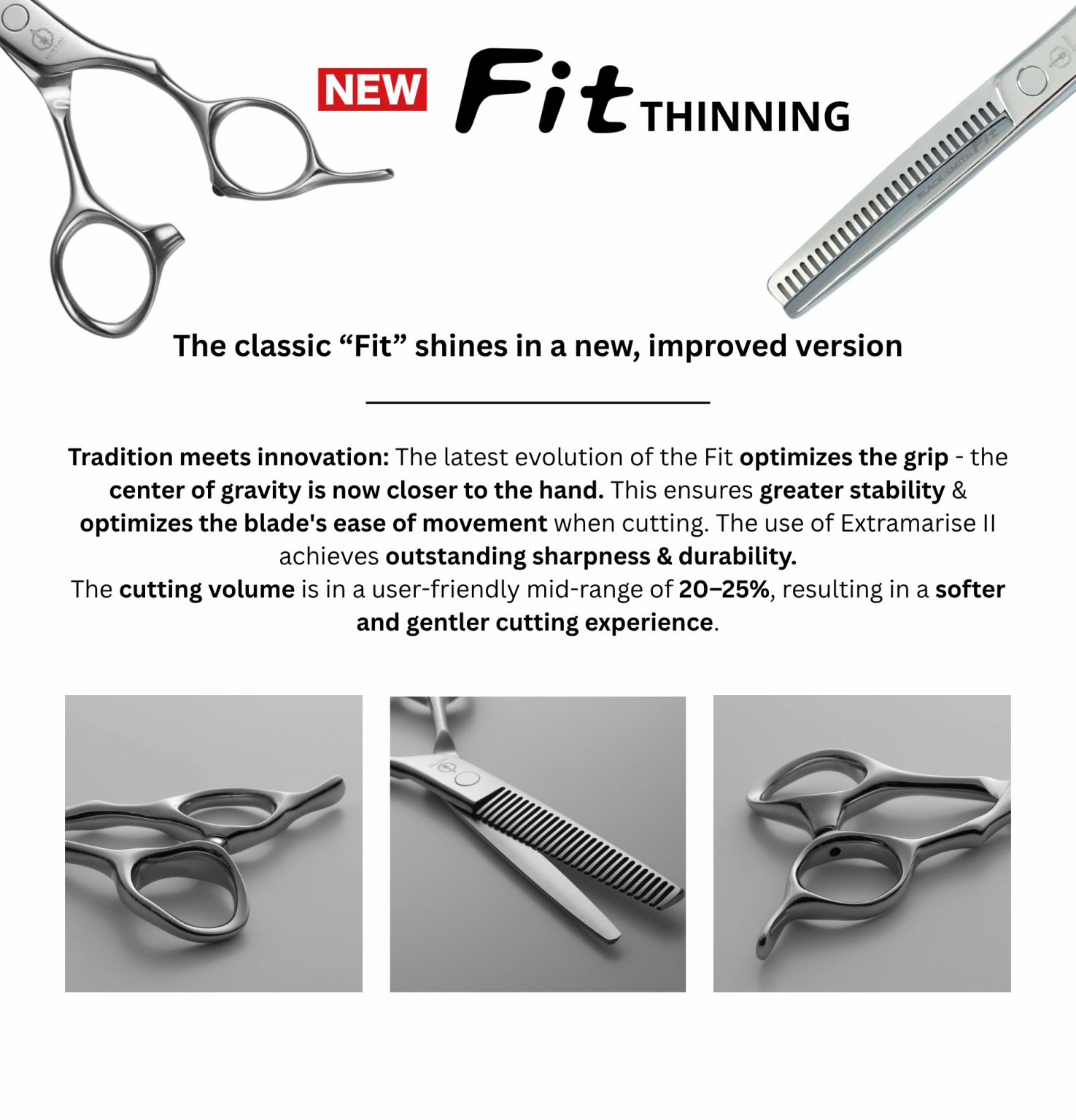 Το Fit Thinning είναι ιδανικό για λείανση, μείωση όγκου και προσθήκη υφής, αποτελώντας ένα εργαλείο που συνδυάζει τεχνική ακρίβεια, άνεση και υψηλή ποιότητα κατασκευής, ιδανικό για επαγγελματίες που επιδιώκουν φυσικό και τέλειο φινίρισμα σε κάθε κούρεμα.