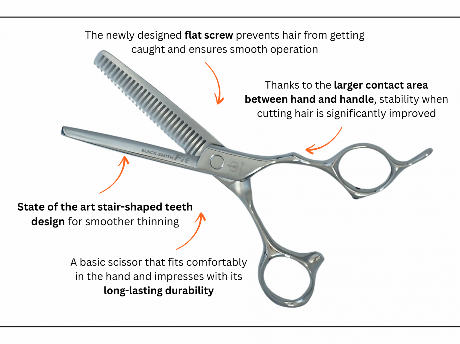 Το Νέο Fit Thinning είναι ένα επαγγελματικό ψαλίδι αραιώματος/φιλαρίσματος (thinning) σχεδιασμένο για κομμωτές και στιλίστες που επιθυμούν λεπτό, φυσικό αποτέλεσμα χωρίς τραβήγματα. Ανήκει στη δημοφιλή σειρά BLACK-SMITH New Fit, γνωστή για την εργονομία και την εξαιρετική σταθερότητα κατά τη διάρκεια του κουρέματος. Το ειδικά σχεδιασμένο σχήμα λαβής και το κέντρο βάρους που βρίσκεται πιο κοντά στη λαβή προσφέρουν βελτιωμένη άνεση, λιγότερη κόπωση και σταθερότητα, ακόμη και μετά από πολύωρη χρήση.